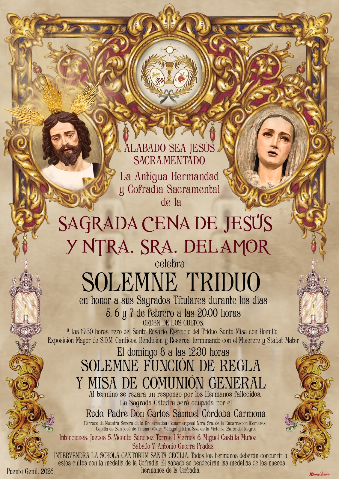 La Antigua Hermandad y Cofradía Sacramental de la Sagrada Cena de Jesús y Nuestra Señora del Amor, celebra Solemne Triduo en la Parroquia de San José, en honor a sus sagrados titulares, durante los días 5, 6 y 7 de febrero a las 20:00 de la tarde