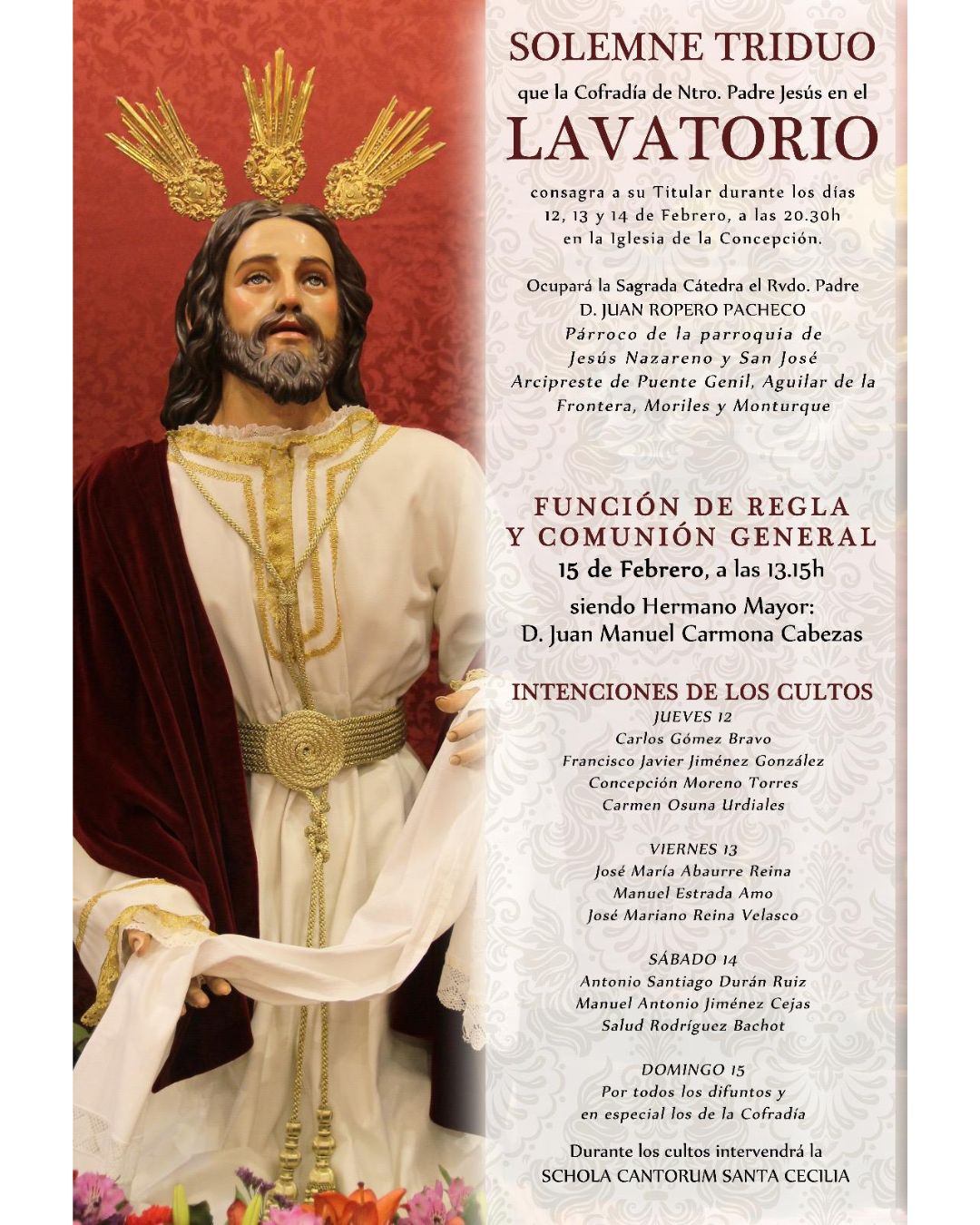 La Cofradía de Nuestro Padre Jesús en el Lavatorio de los pies consagra a su titular con la celebración del Solemne Triduo durante los días 12, 13 y 14 de febrero a las 20:30 de la noche en la Iglesia de la Concepción, sede canónica de la hermandad