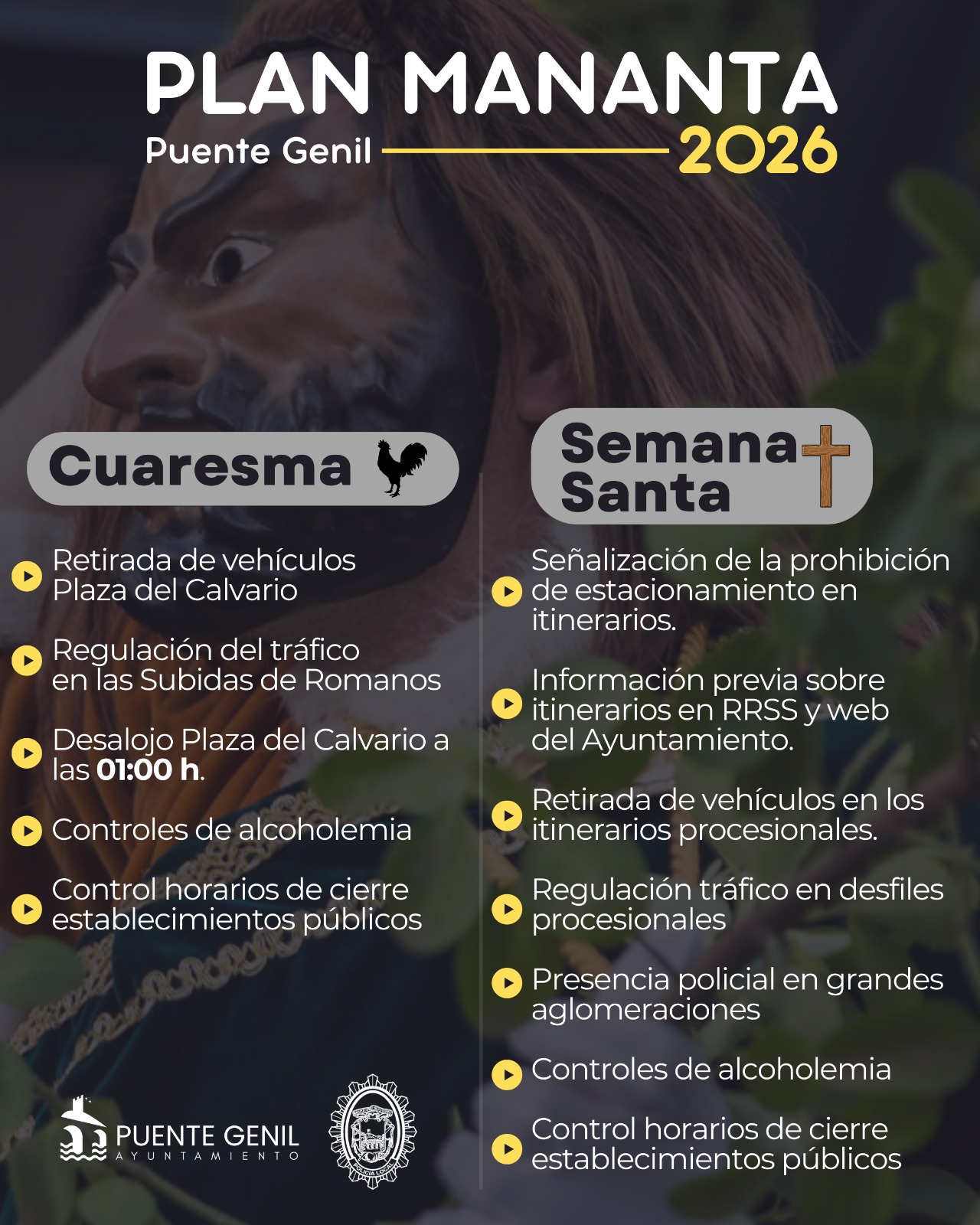 Consulta aquí todas las medidas del Plan Mananta 2026 coordinado por la Agrupación Cofradías de Puente Genil – Córdoba, Policía Local Puente Genil , Ayuntamiento y Egemasa y ayúda a que todo funcione con normalidad.