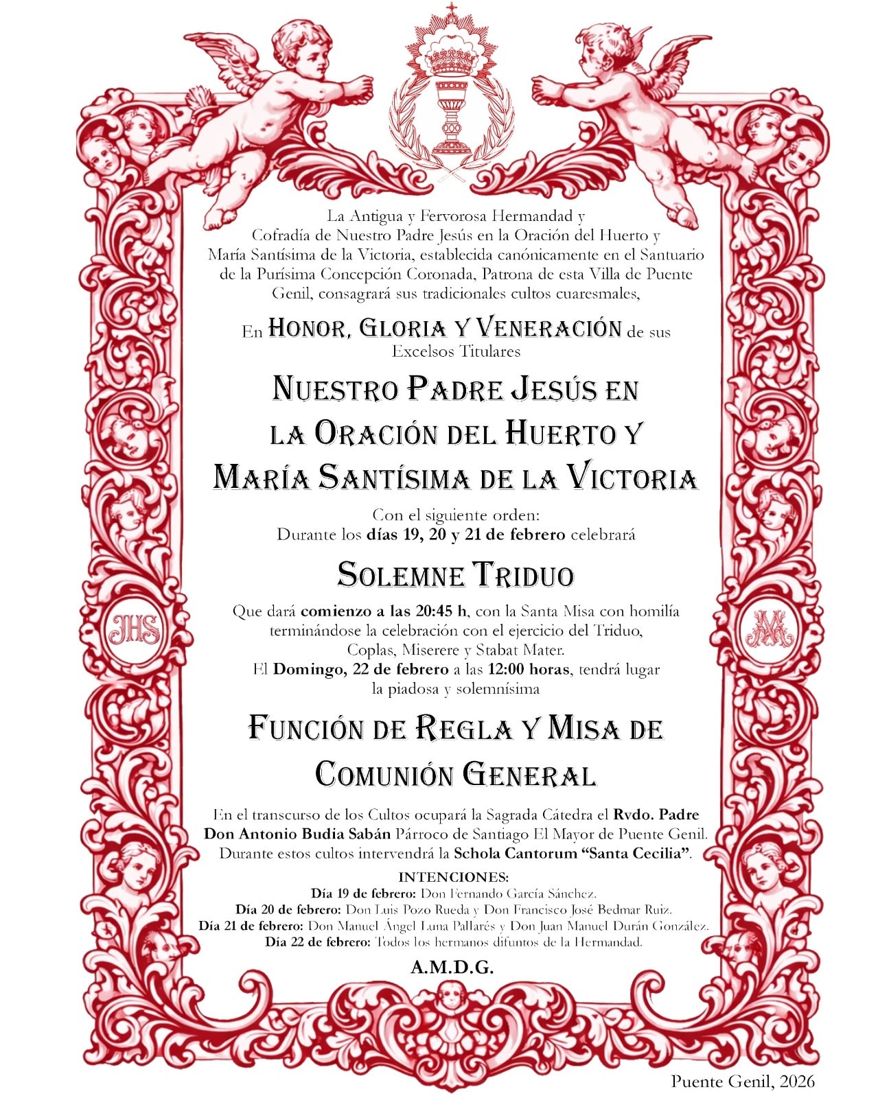 La Antigua y Fervorosa Hermandad y Cofradía de Nuestro Padre Jesús en la Oración del Huerto y María Santísima de la Victoria consagra a sus titulares con la celebración del solemne triduo durante los días 19, 20 y 21 de febrero a las 20:45 de la tarde en la iglesia de la Concepción, sede canónica de la hermandad
