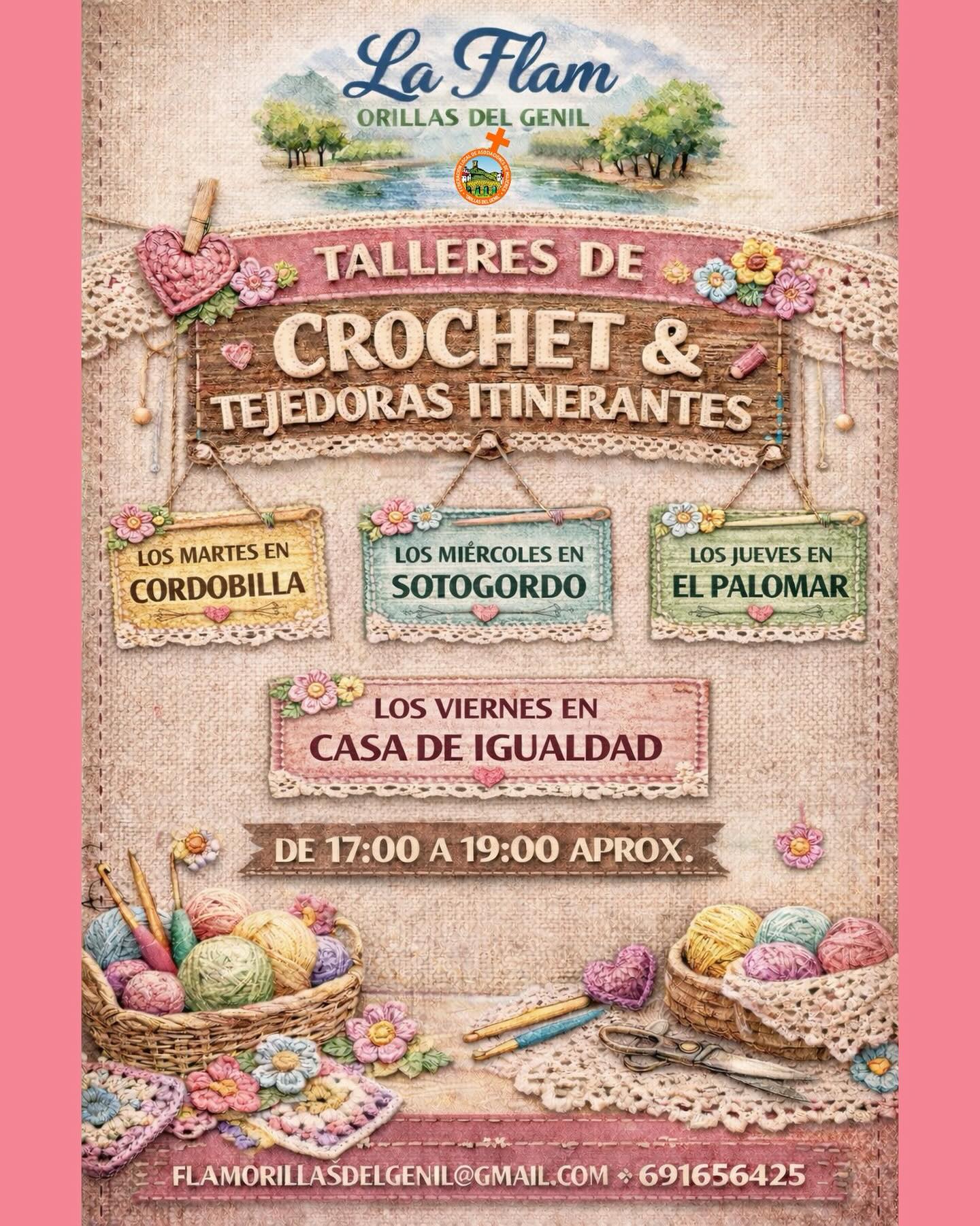 La Federación Local de Asociaciones de Mujeres de Puente Genil (Flam Orillas del Genil) pone en marcha los talleres de Crochet & Tejedoras Itinerantes. Un espacio para crear, compartir y disfrutar del arte de tejer en buena compañía, dirigido tanto a quienes ya saben, como a quienes quieren empezar desde cero.