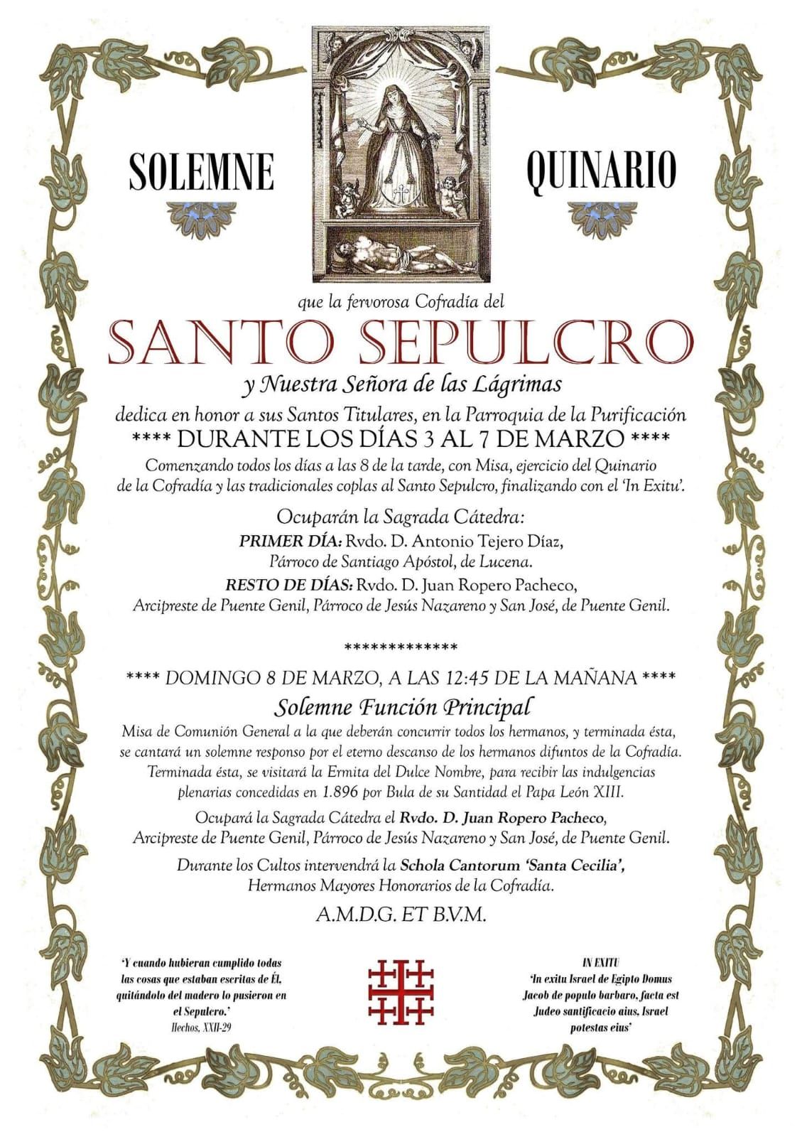 La Cofradía del Santo Sepulcro y Nuestra Señora de las Lágrimas, establecida canónicamente en la Parroquia de la Purificación, celebra Solemne Quinario entre el 3 y el 7 de marzo a las 20:00 de la tarde