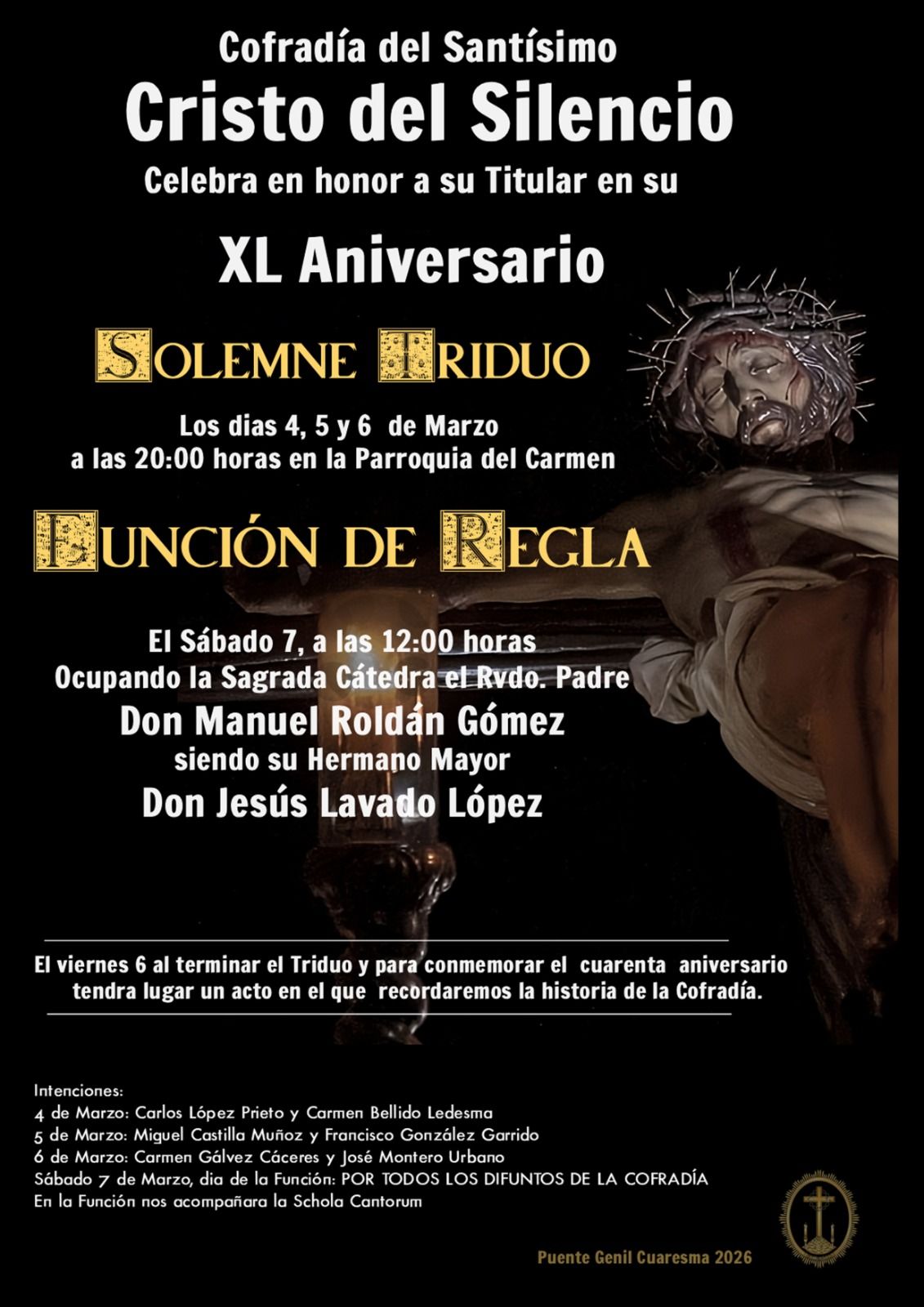 La Cofradía del Santísimo Cristo del Silencio, erigida canónicamente en la Parroquia de Nuestra Señora del Carmen, celebra Solemne Triduo en honor a su titular durante los días 4, 5 y 6 de marzo a las 20:00 de la tarde.