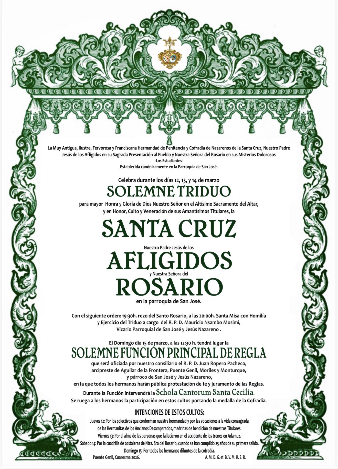 La Muy Antigua, Ilustre y Fervorosa Hermandad Franciscana y Cofradía de Nazarenos de la Santa Cruz, Nuestro Padre Jesús de los Afligidos en su Sagrada Presentación al pueblo y Nuestra Señora del Rosario en sus Misterios Dolorosos (Los Estudiantes), establecida canónicamente en la Parroquia de San José , celebra Solemne Triduo en honor a sus sagrados titulares durante los días 12, 13 y 14 de marzo con el siguiente orden: a las 19:30 hrs , rezo del Santo Rosario, y a las 20:00 hrs, Santa Misa con Homilía a cargo de don Juan Ropero Pacheco